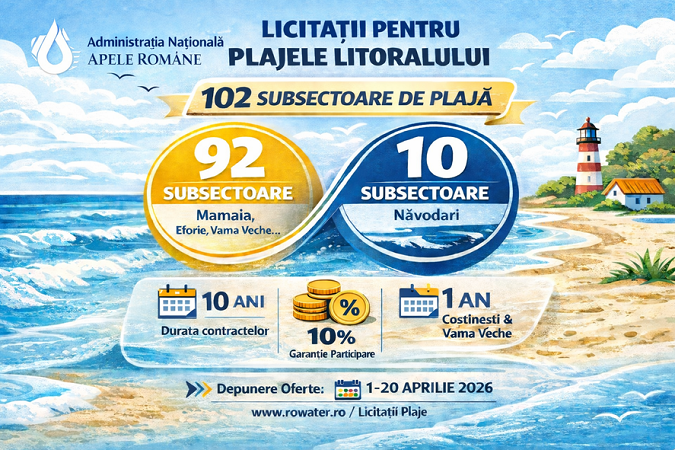 Administrația Națională 'Apele Române' organizează două etape de licitație publică pentru 102 subsectoare de plajă din stațiunile de...